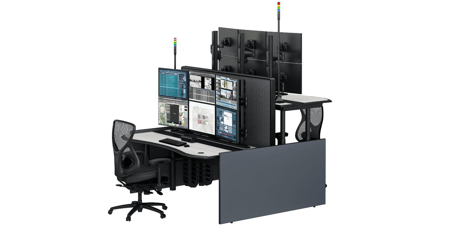 The Vue Console is a high-performance, modern operator workstation designed for mission-critical environments such as command centers, security operations, and emergency response rooms. Available in a variety of sizes and configurations, it offers ergonomic design, modular flexibility, and durable construction to support continuous operations.